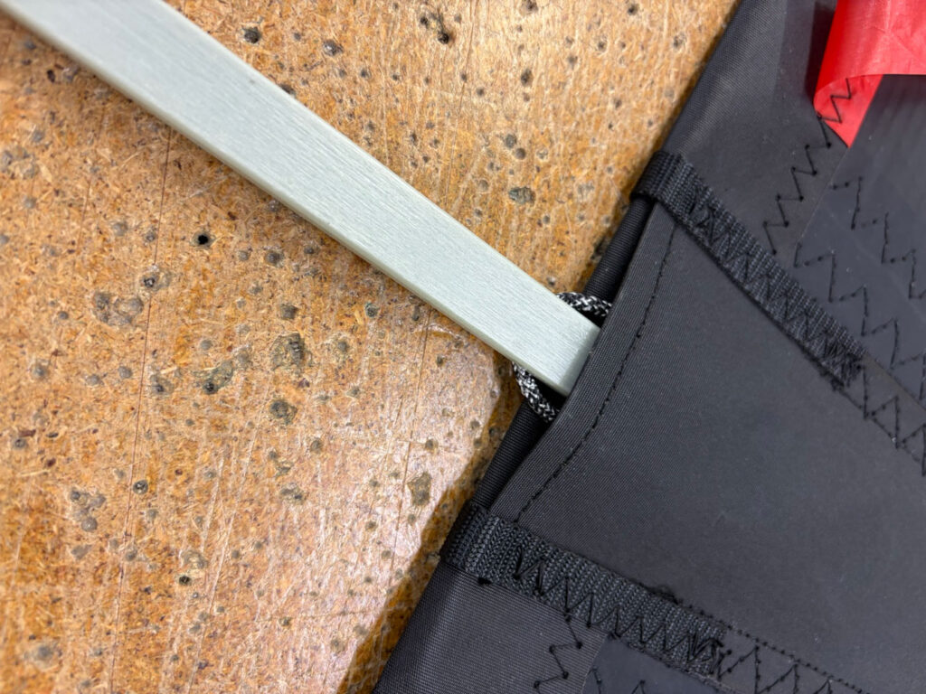 Lay the sail out flat with the batten pockets facing upwards. Identify each batten and check any markings or labels so you know which pocket it belongs in. On most labelled sets, the numbering indicates the batten order – follow the labels on your battens and work methodically pocket by pocket. Before inserting the batten, locate the 3mm loop sewn into the leech at the end of the pocket and slide the batten over the top.
