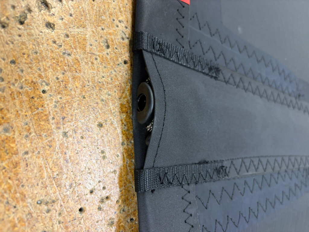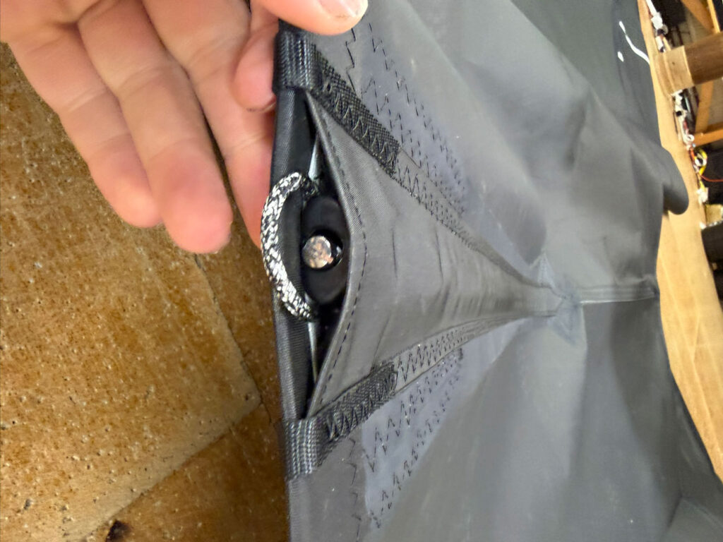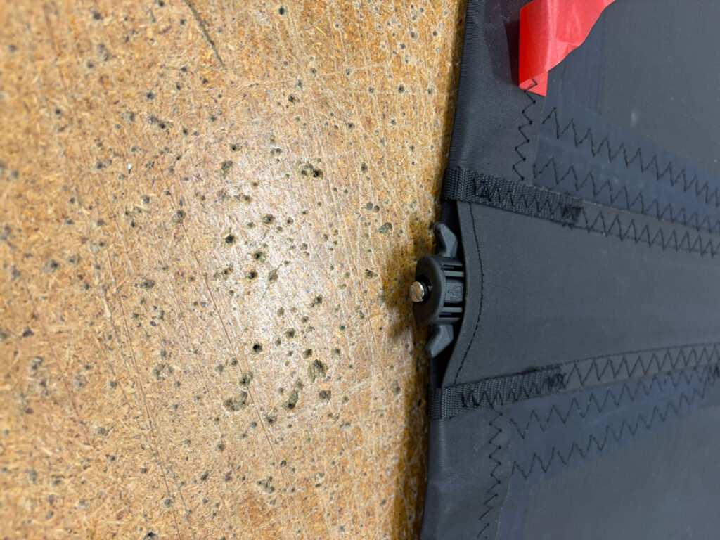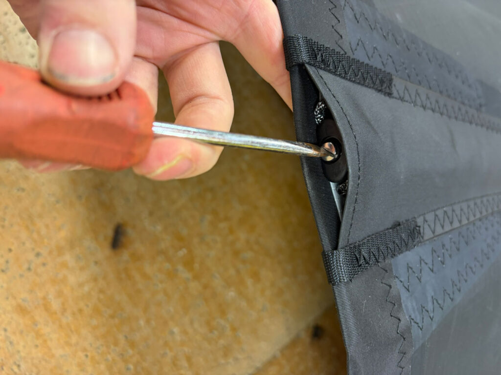Once the batten is fully inserted, hook the 3mm loop over the top of the rocket. This loop acts as the anchor point that the rocket tensions against. You will see the adjustment screw at the end of the batten. Turn the screw clockwise to apply tension gradually. The aim is for the batten to sit firm and stable, with the batten end finishing close to flush with the leech when correctly tensioned. Small variations between pockets are normal with a difference of ± 5mm expected.