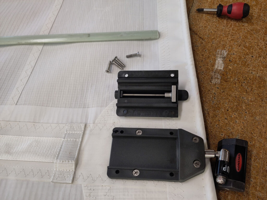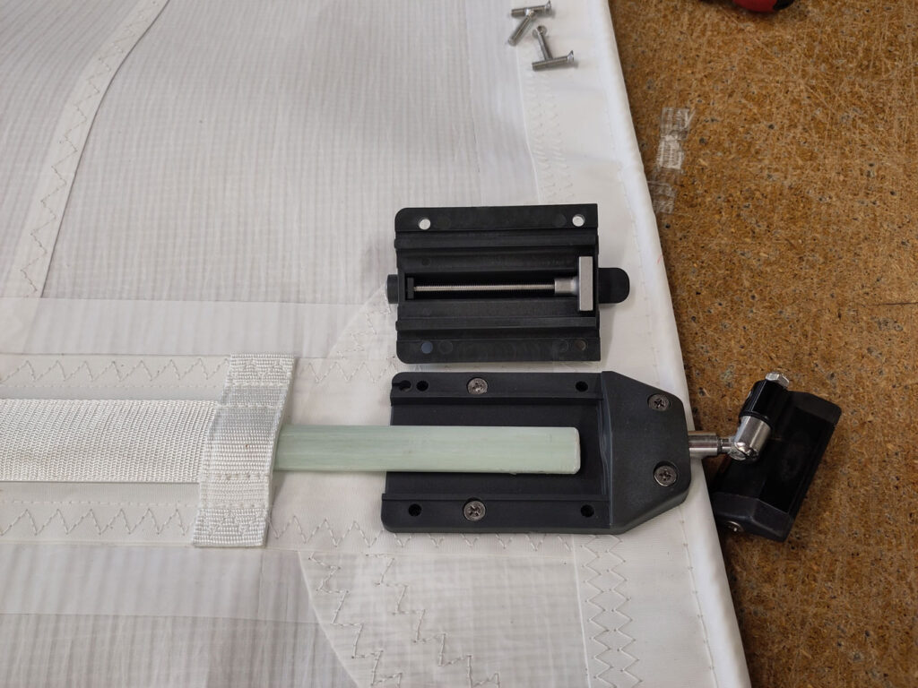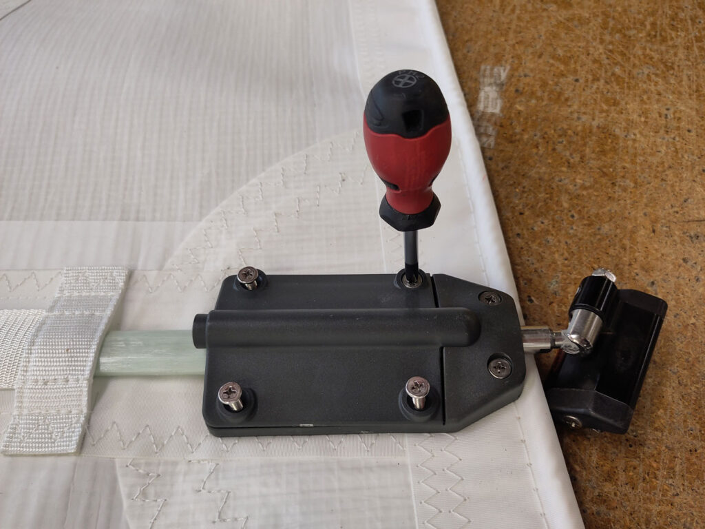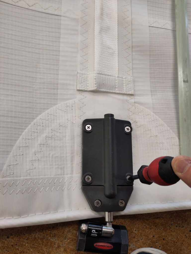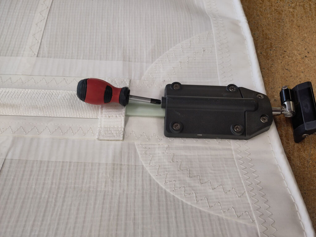 The majority of our full-length batten pockets are luff-loaded, allowing compression cars to be threaded onto the luff via a batten receptacle. If conditions allow, the easiest method is to hoist the mainsail and load one batten at a time from the top down as the sail is fed into the mast track. Alternatively, battens can be fitted on deck or from a stable pontoon before hoisting. Locate the appropriate batten and, using a Phillips screwdriver, remove the four most aft screws from the batten receptacle. Please take care not to lose the nylon nut situated underneath.