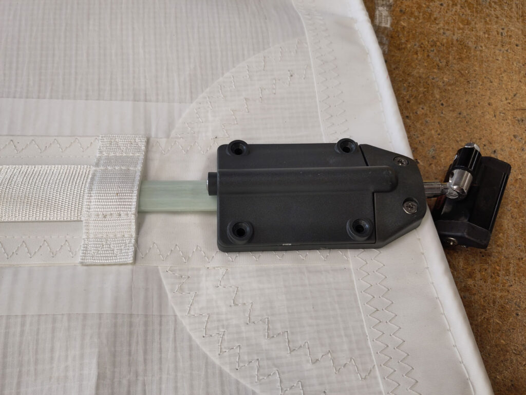 Once the outer cover is removed, slide the batten into the pocket from the luff towards the leech. We only use Sailman receptacles on larger mainsails (typically 42ft and above) where we most commonly supply BlueStreak non-tapered battens, meaning either end can be inserted first. Push the batten fully home until it seats neatly inside the box at the inboard end.