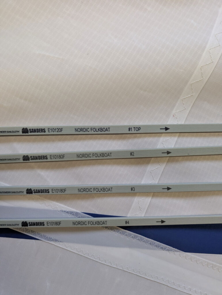 Slip-in elastic batten pockets are most commonly used on dinghies and smaller keelboats. Batten tension is created by an elastic webbing retainer at the inboard end of the pocket, which holds the batten firmly once installed. These pockets are designed for tapered leech battens, so identify your battens first and check for any numbering to confirm the correct order. Lay the sail out flat with the leech facing towards you.