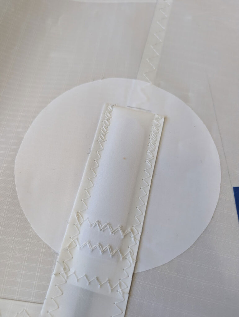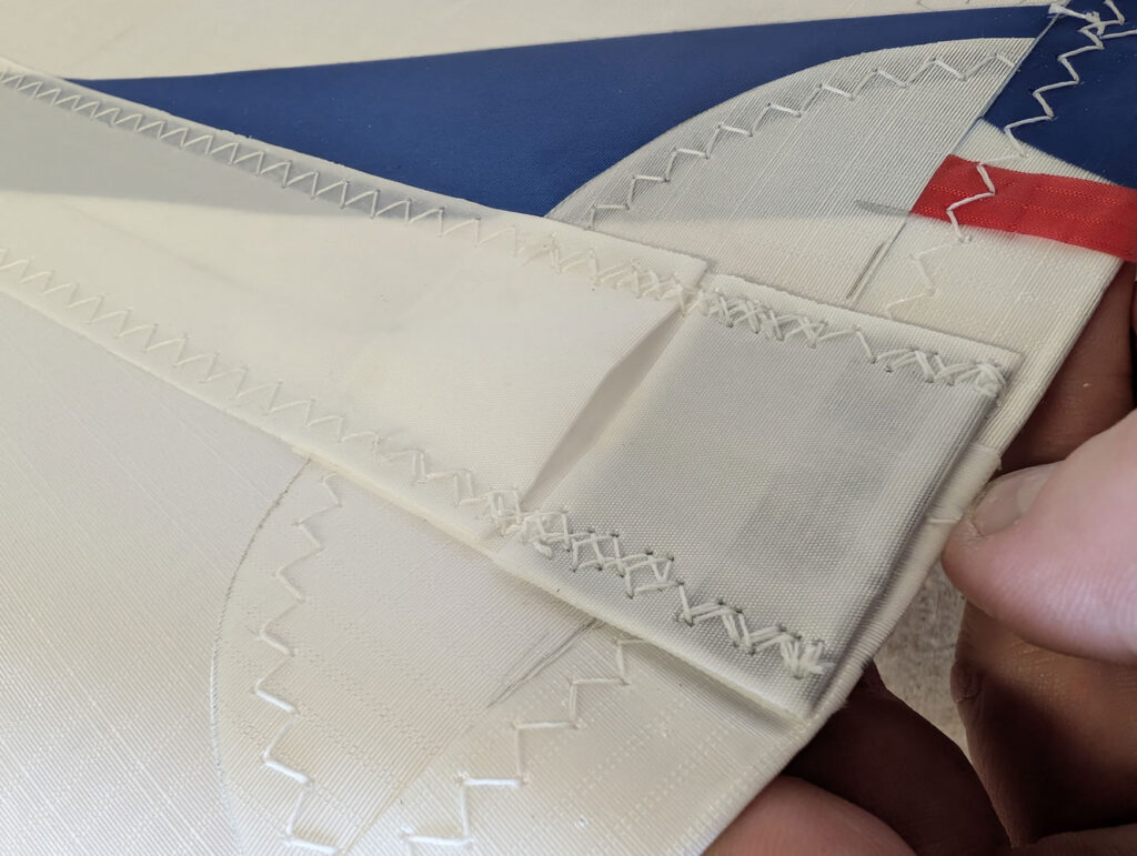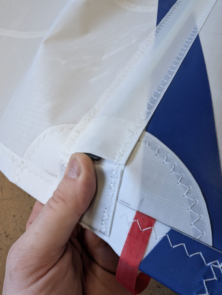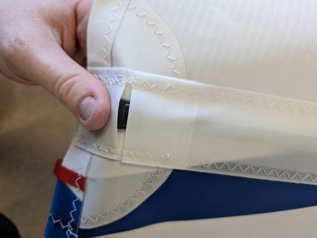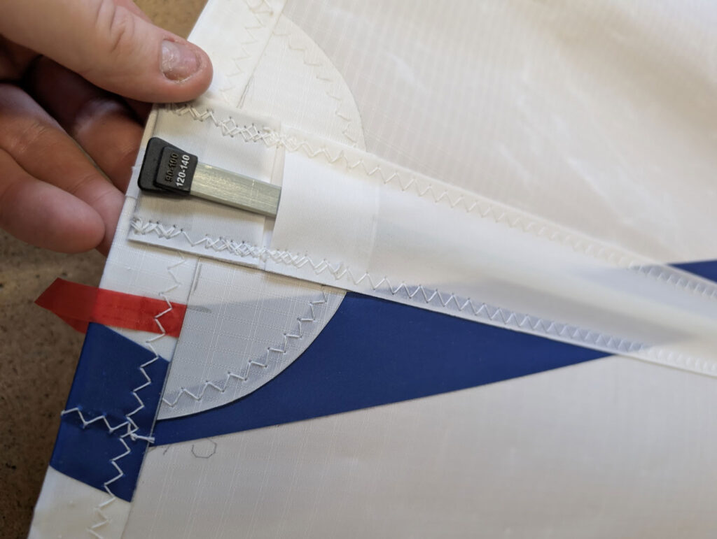 Continue pushing the batten inboard towards the luff, applying gentle pressure against the elastic webbing at the inner end of the pocket. Once fully inserted, peel the leech section of the pocket open slightly to allow the elastic to pull the batten back and seat it firmly against the leech end of the pocket.