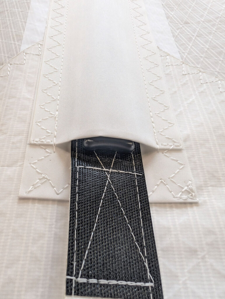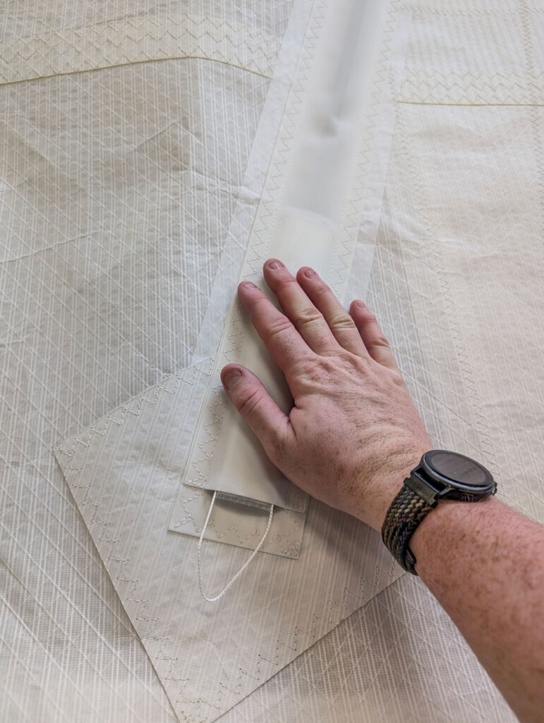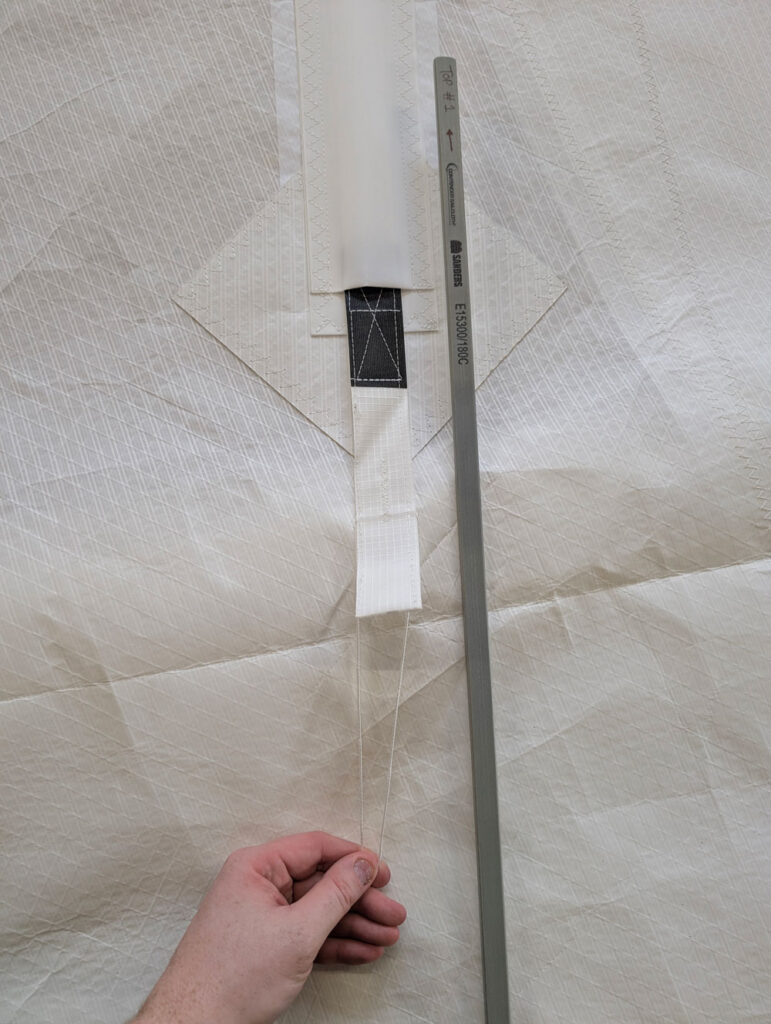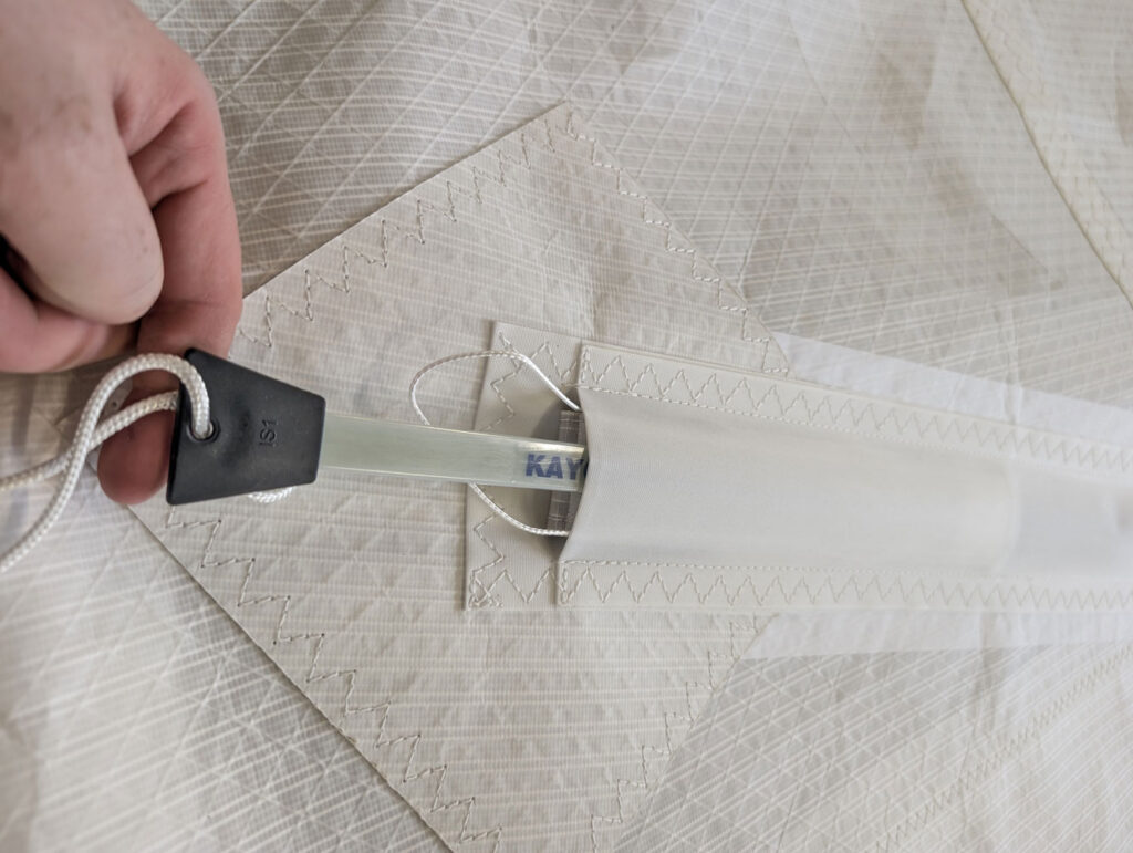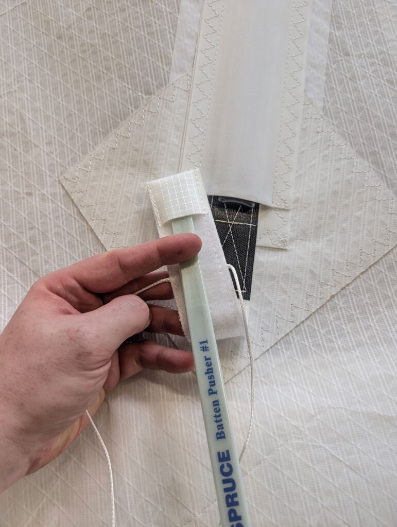 Once the correct tension is set, remove the batten loader by keeping gentle pressure on top of the pocket to prevent the tab pulling back. Press firmly along the full length of the Velcro closure to ensure it is properly engaged and secure. Repeat the process for each batten, working methodically from the top of the sail downwards.
